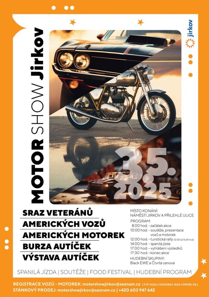 Organizátoři připomínají, že registrace vozů a motorek je možná na e-mailu motorshowjirkov@seznam.cz, stejně jako přihlášky ke stánkovému prodeji. Více informací lze získat i na telefonním čísle +420 603 947 642.